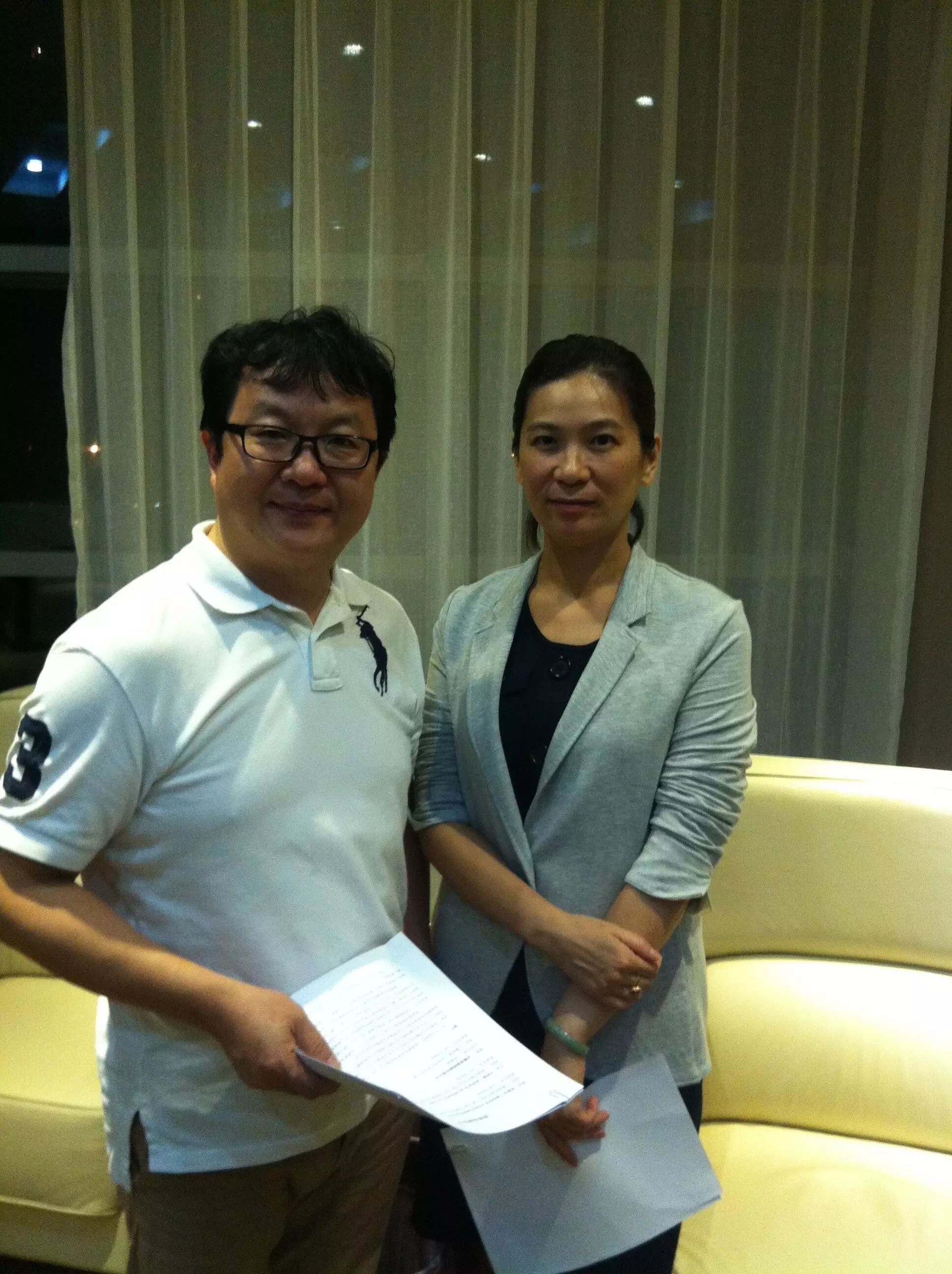 图为李勇志先生与资方Janen签署协议合影